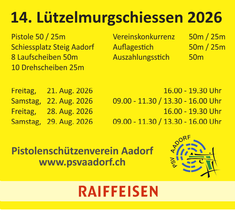 Herzlich Willkommen auf der Website des PSV Aadorf. Diese richtet sich nicht nur an die Mitglieder, sondern auch an interessierte Schützen aus anderen Vereinen. Es soll auch „Nicht-Schützen“ einen Einblick in unsere Vereinsstrukturen geben und zu einem Besuch beim PSV Aadorf einladen.